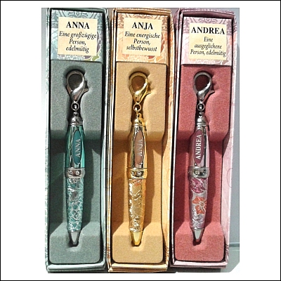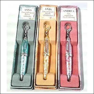 Ob einzeln oder als Set bestechen sie in jedem Fall durch ihre ansprechende Optik, wobei bei der Version für sie Notizbuch und Kugelschreiber elegant schillern und, als absolutes Highlight, mit einem Strassstein besetzt sind.Sie werden in attraktiven Geschenkboxen präsentiert, die mit der Bedeutung des einzelnen Namens versehen sind.