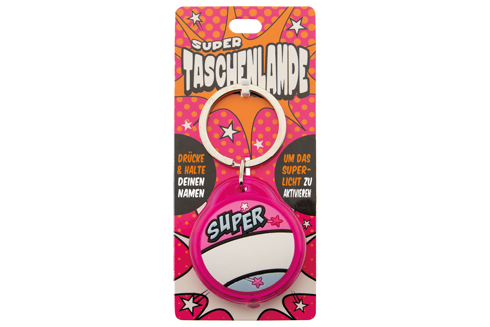 Super Taschenlampe - Schluessel Anhaenger auch fuer Schulranzen - als Geschenk - individuell mit Namen und Spruch. Kinder werden von der coolen Super Taschenlampe begeistert sein und ihre eigenen kleinen Superhelden-Taschenlampen lieben! Mini-Leuchtanhaenger sind praktisch, lustig und mit individuellen Namen oder Spruechen versehen. Das farbenfrohe Comicdesign laesst die Herzen junger Superheldinnen und Superhelden hoeherschlagen und die froehlichen Farben und Bilder werden die Aufmerksamkeit der Kinder garantiert auf sich ziehen. Mit über 190 beliebten Namen und allgemeinen Titeln in trendigen Designs ist garantiert fuer jeden die richtige Super Taschenlampe dabei, Die Taschenlampe hat eine Groesse von 5 x 4 cm Einfach an Schultasche, Federmappe oder Kleidung anhaengen. Der Preis gilt für 1 Stueck.