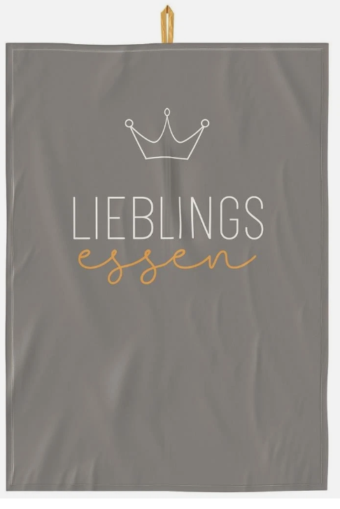 Geschirrtuch Lieblingsessen, Küchenhandtuch mit Kronen-Design, Grau mit Goldener Schrift