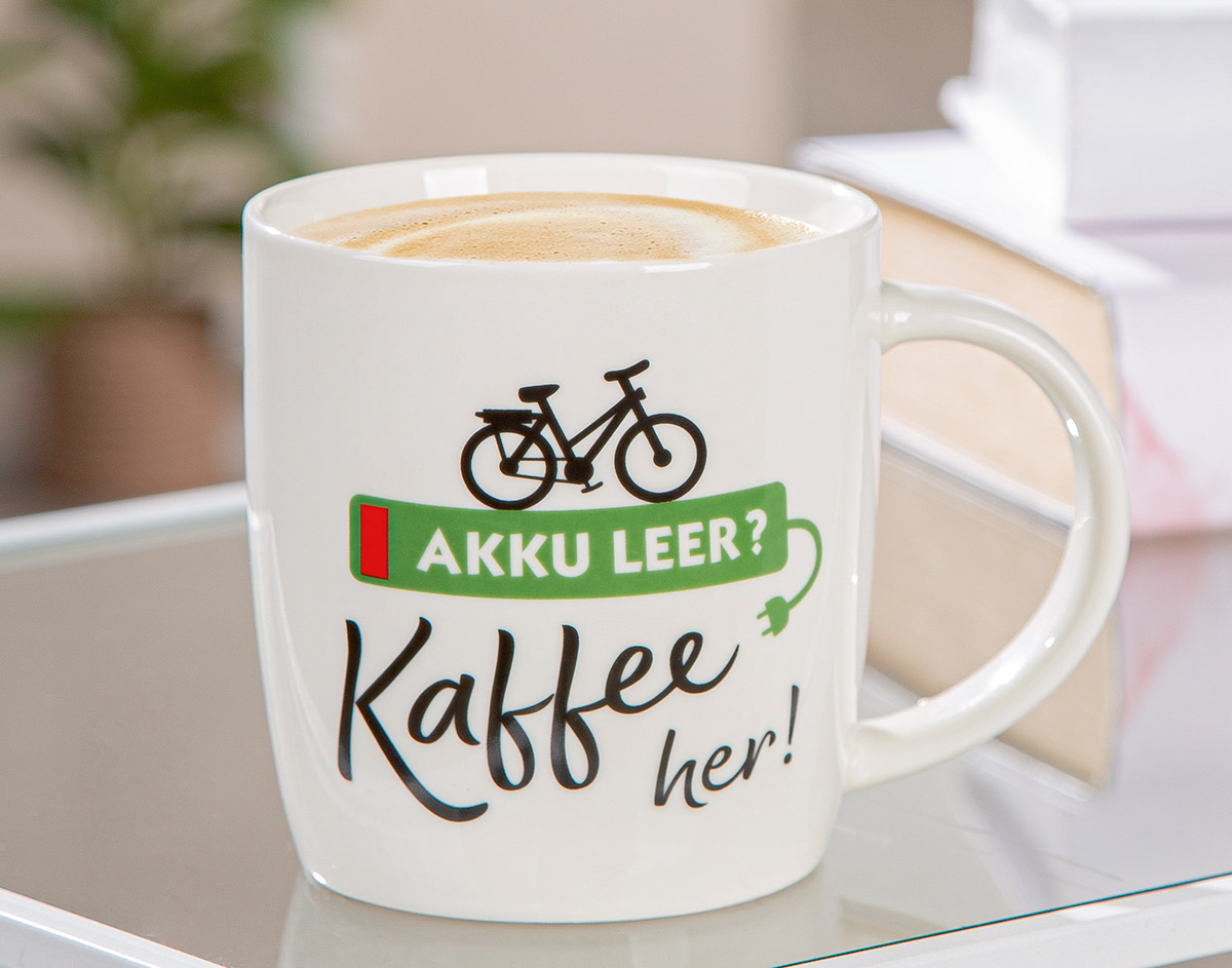 Kaffeetasse mit Spruch "Akku leer? Kaffee her!", - Geschenke für Fahrradfahrer