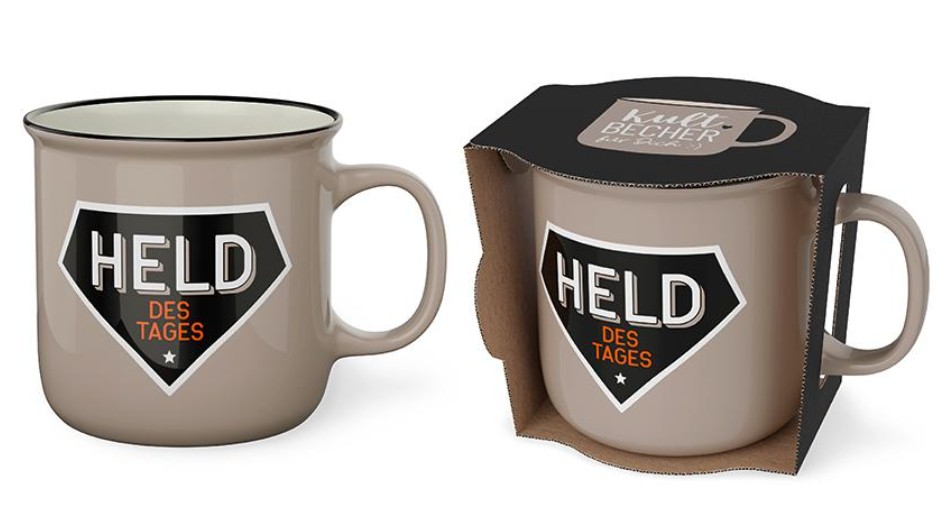 Tasse Becher Keramik grau, 250 ml, Tasse mit Spruch, 1 Stück - Held des Tages