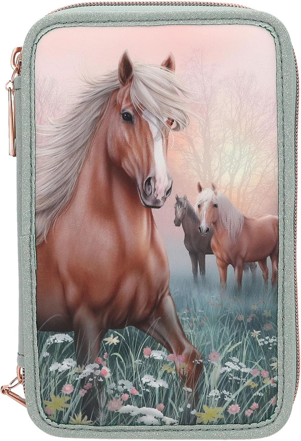 Depesche 13403 Miss Melody Romantic Fields - Gefüllte 3-Fach Federtasche in Grün, mit Pferde Motiv, Blumen und Glitzer, Federmappe mit Buntstiften, Lineal, Schere UVM. Federmappe für Mädchen in der Schule, Kindergarten und Freizeit Design: Miss Melody by Depesche - In Salbeigrün und Rosa, mit Pferde Motiv, Glitzer, Sonnenaufgang und einer Blumenwiese Ausgestattet mit je 18 Bunt- und Filzstiften, 2 Bleistiften, Doppel-Anspitzer, Radierer, Lineal, Schere, Klebestift und einem Kletttäschchen Cooles Extra: Die roségoldenen Reißverschlüsse und der Logoaufdruck, die einen schönen Glanz haben Maße: ca. 20 x 13 x 7,5 cm