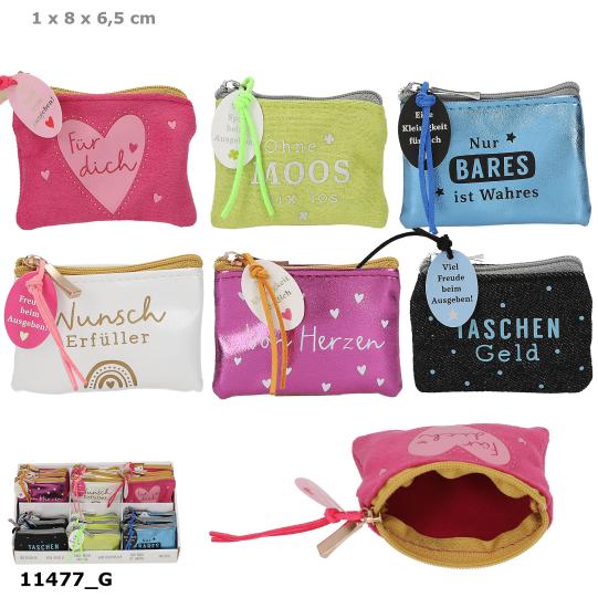 WUNSCHERFÜLLER Papier-Geldbörse 1 Stück von 6, Kleine Portemonnaies aus tollen Stoffen, in schönen Farben und mit kurzen, lustigen "Geld"-Sprüchen. Dank des Reißverschlusses ist jedes Geld-Geschenk sicher verpackt.8x6,5x1cm