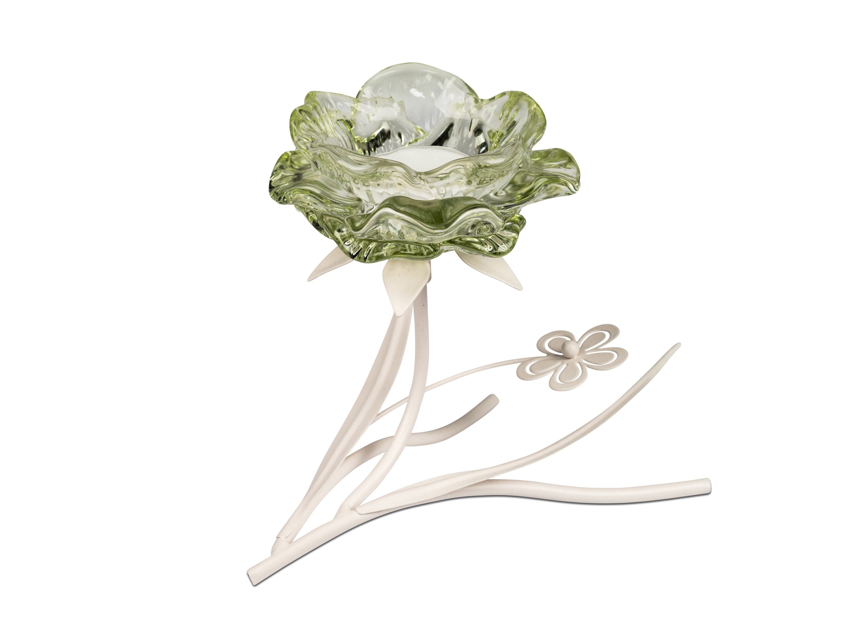 Tischlicht Teelichthalter mit Blüte, Metall und Glas, Grün, 15 cm